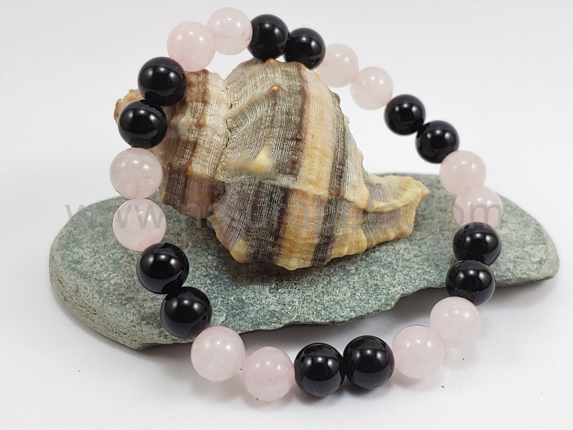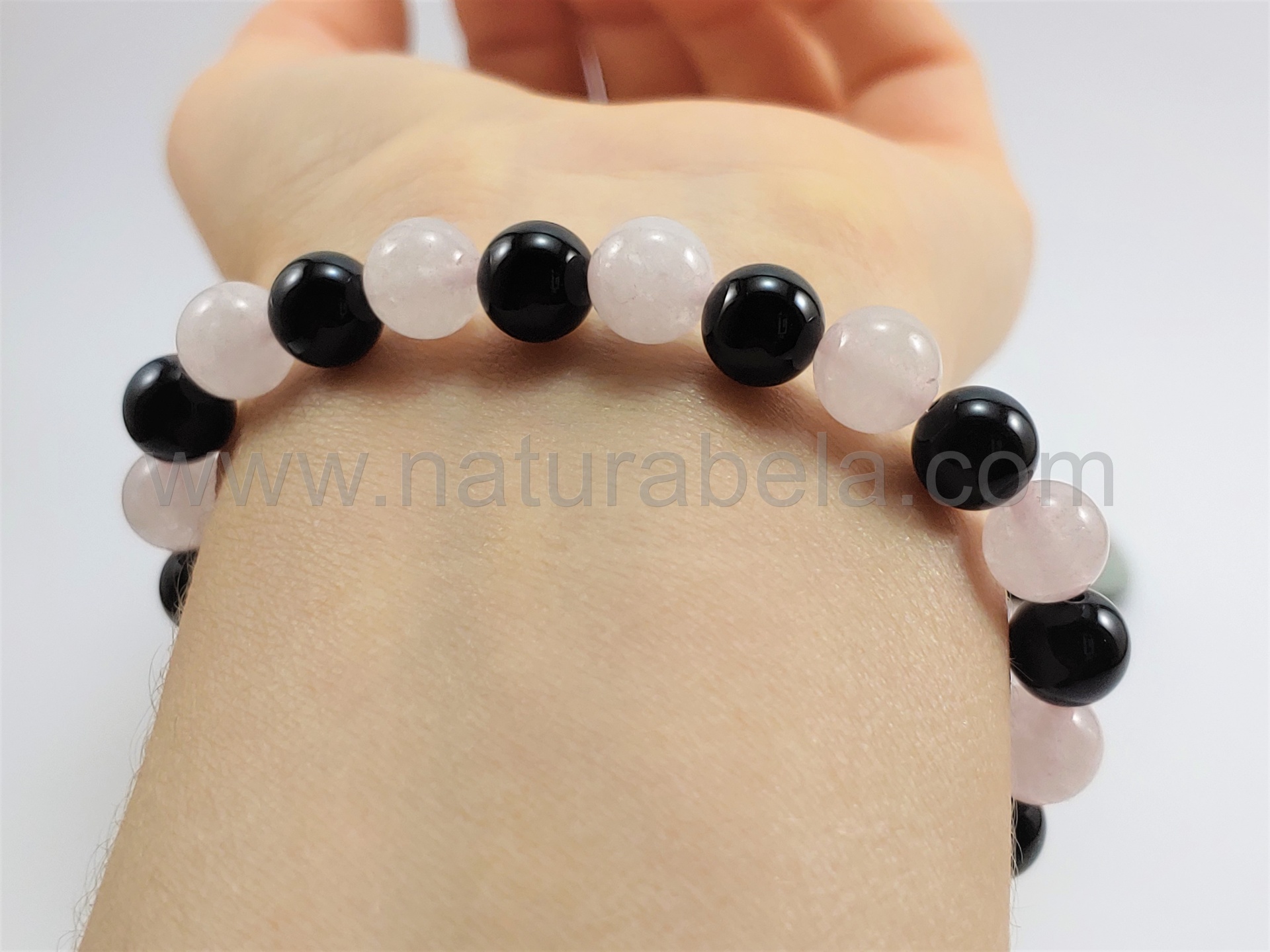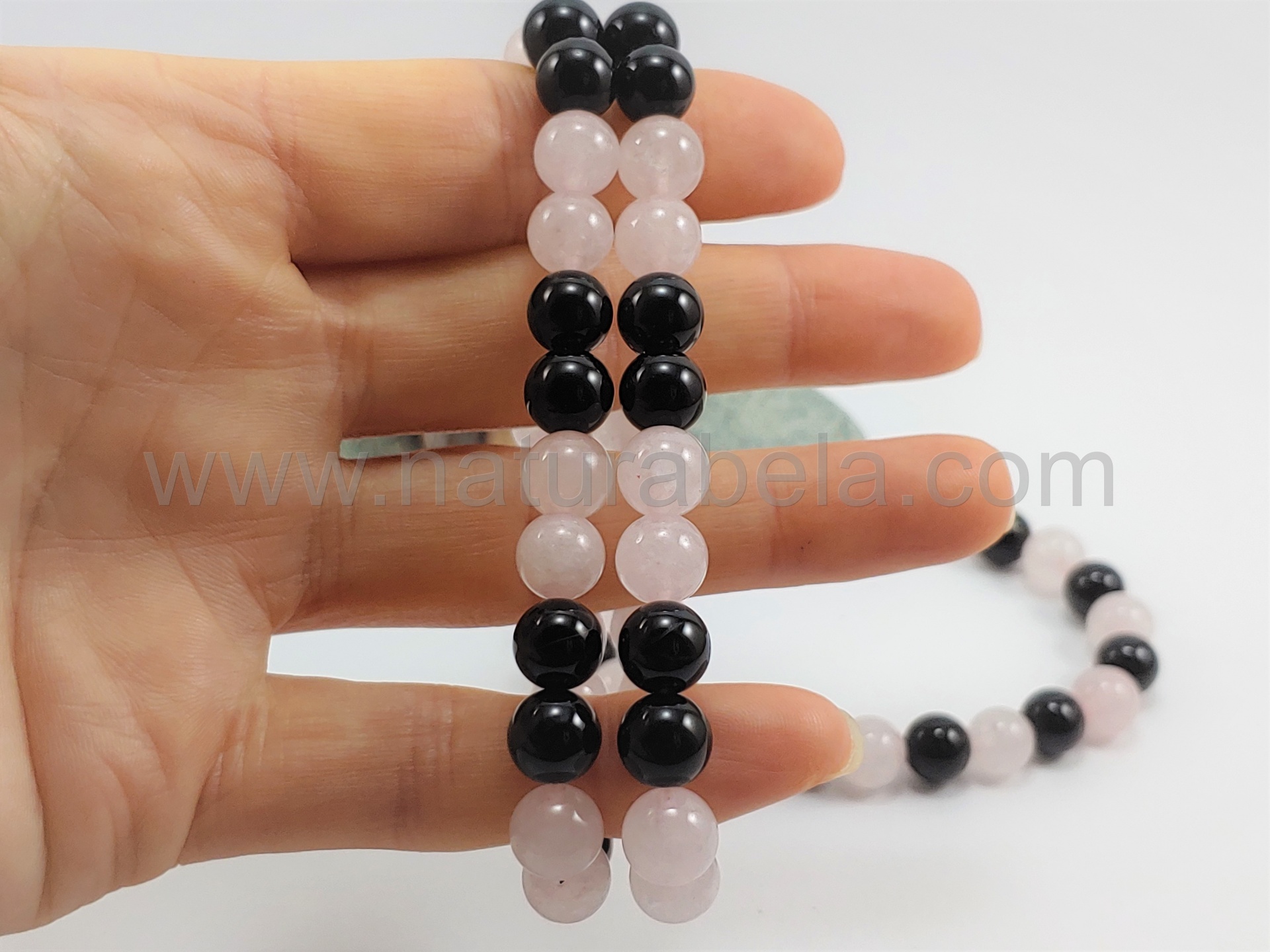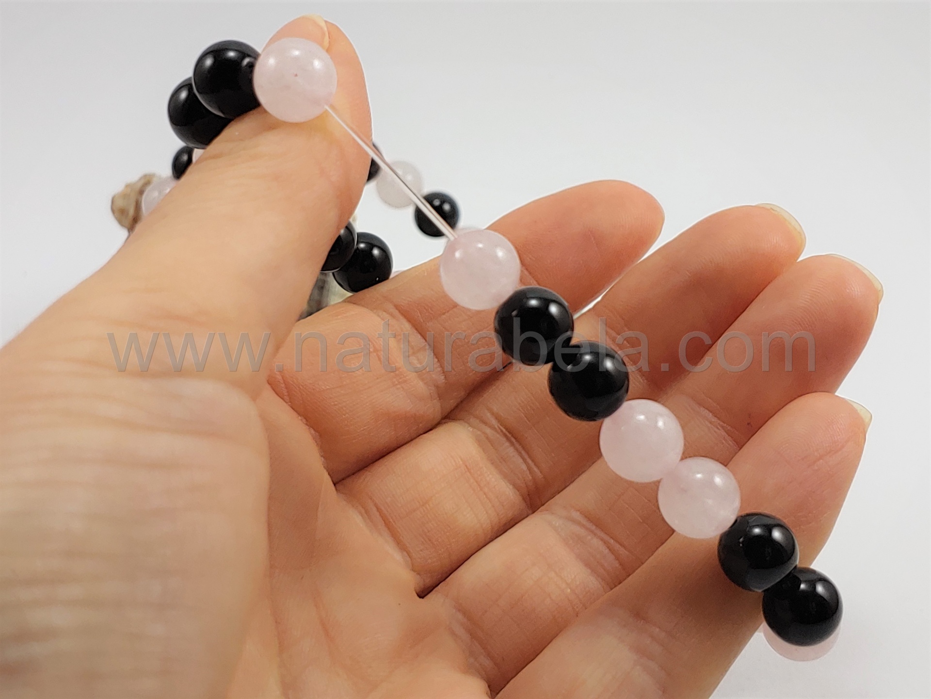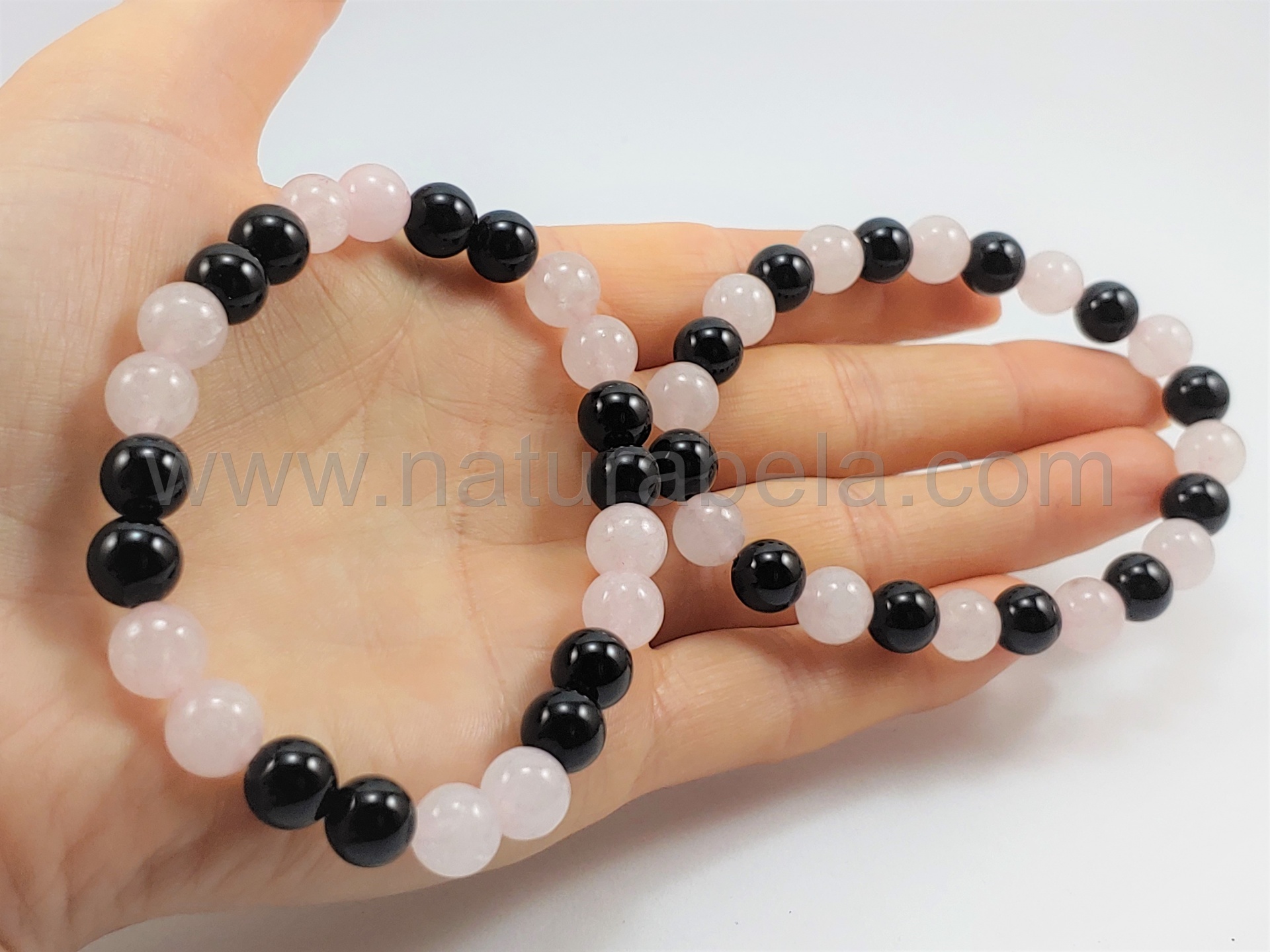 Pulseira bolas 8 mm de Ágata Negra e Quartzo Rosa.