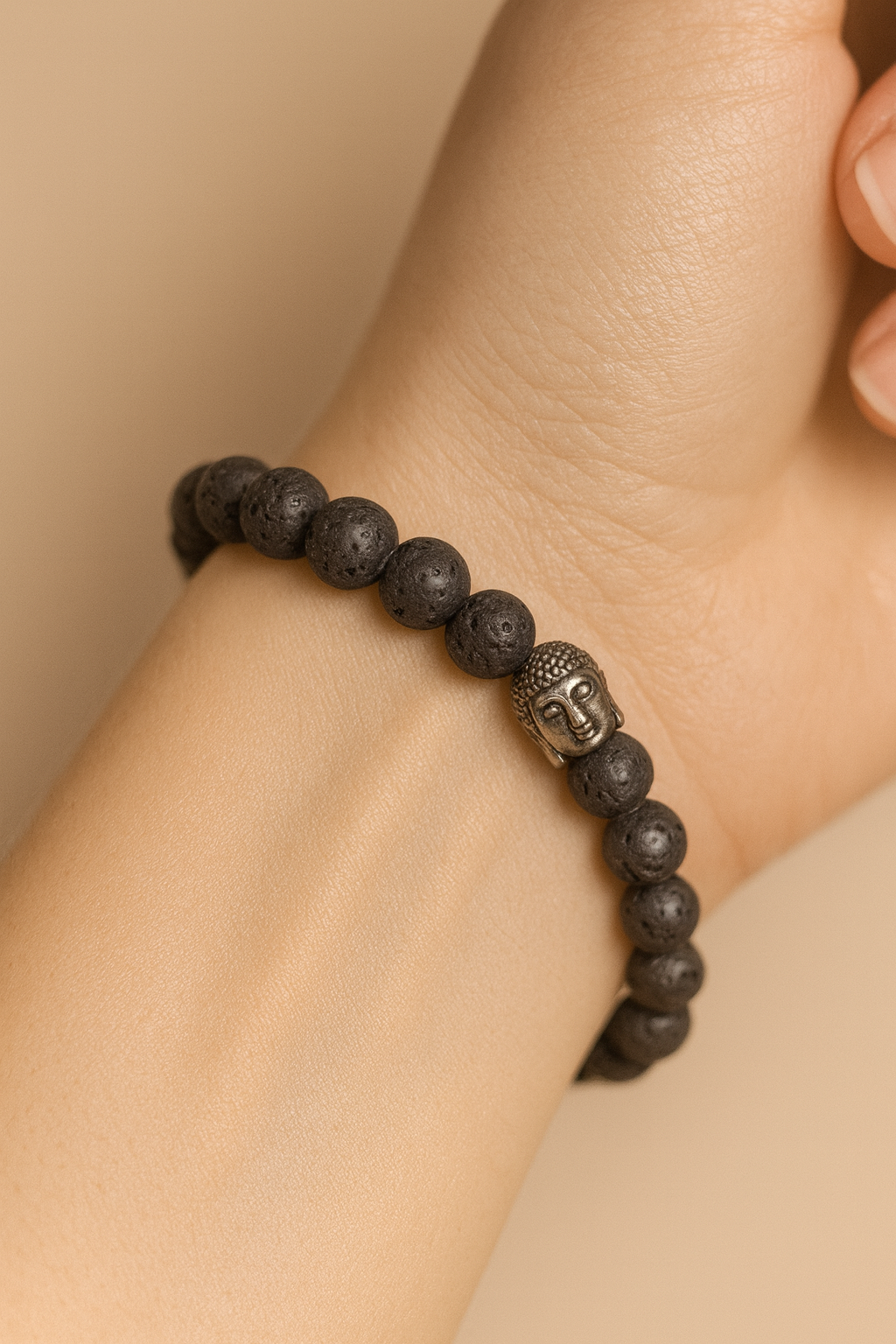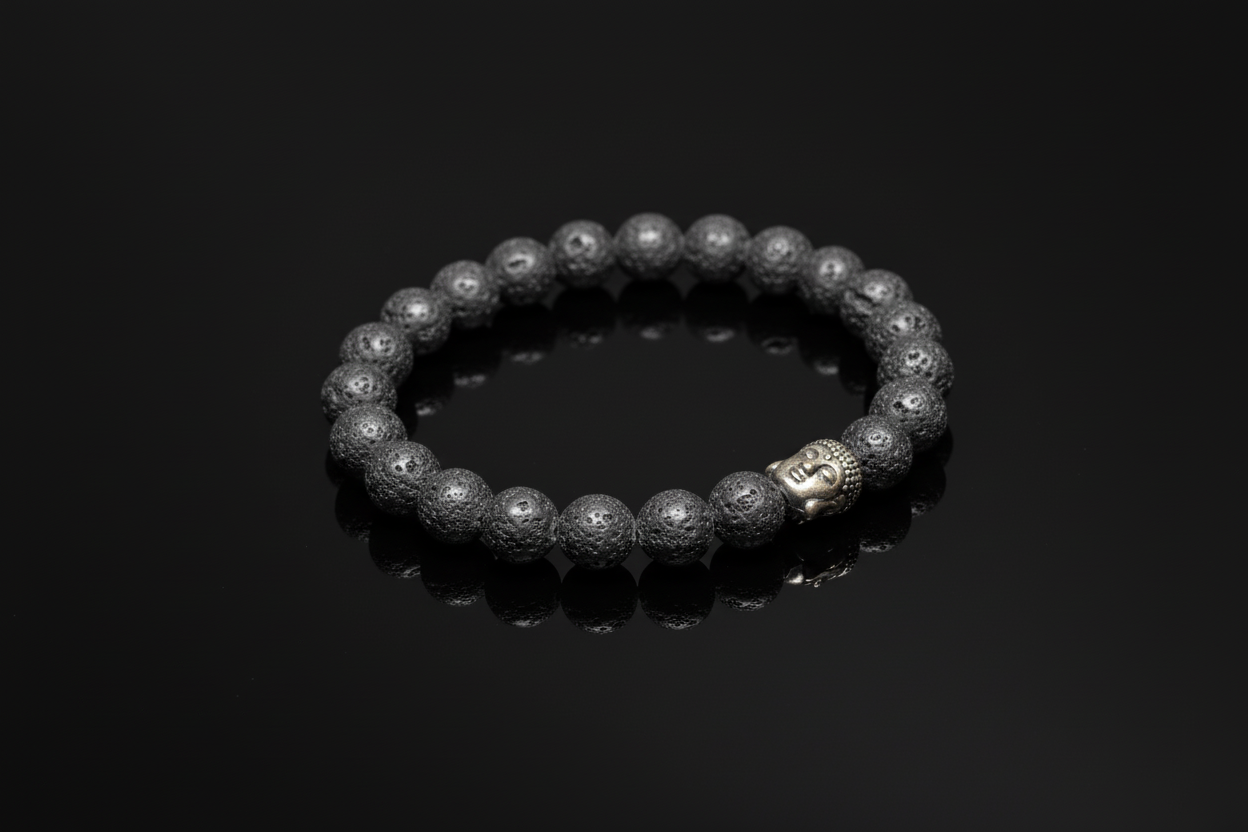 Esta peça é composta por bolas de textura porosa, conferindo um aspeto rústico e autêntico. Ao centro, um discreto Buda metálico representa paz interior, consciência e conexão espiritual — reforçando o propósito energético da pulseira.