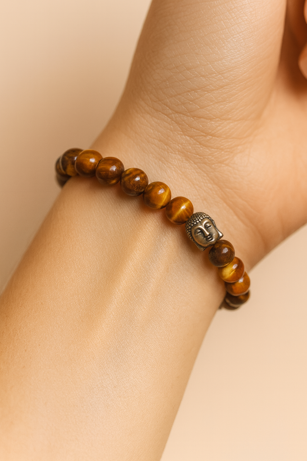 Pulseira Elástica Olho-de-Tigre com Buda (8mm)