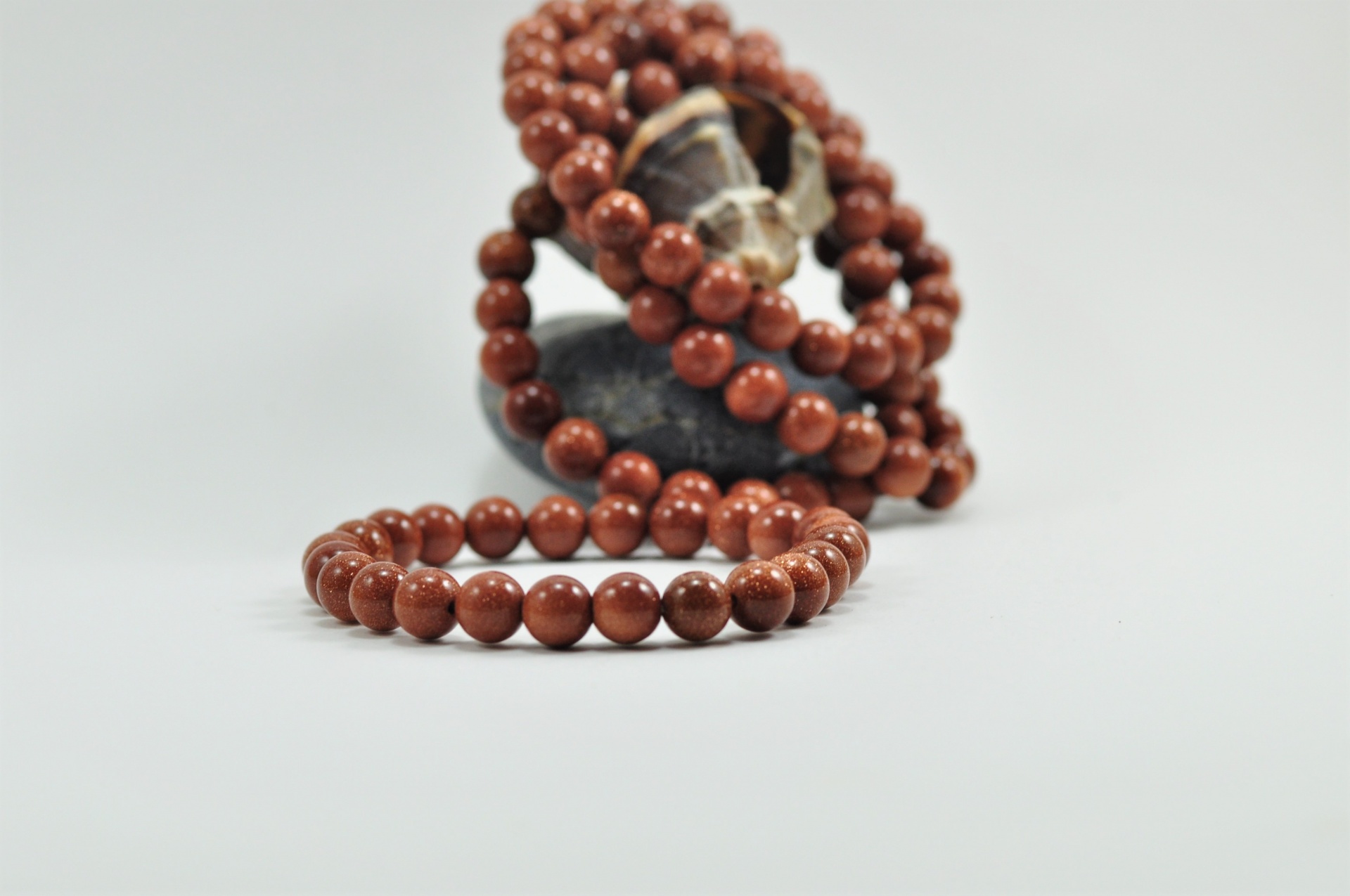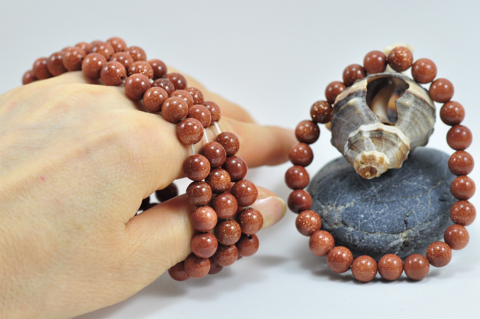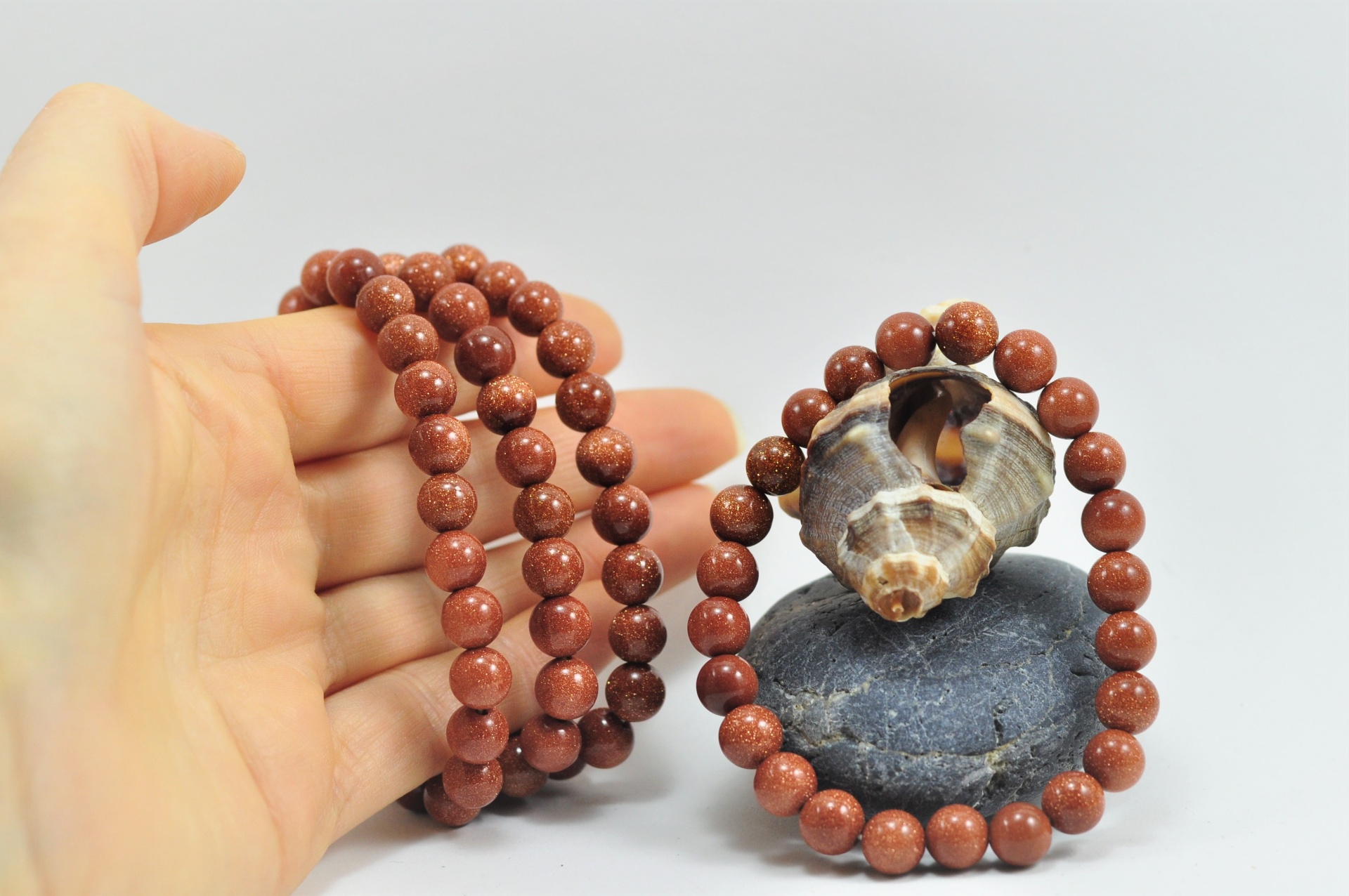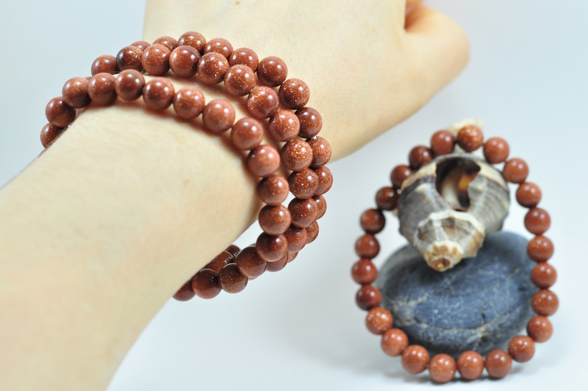 Estas pulseiras contêm 24 bolas de 8mm cada da pedra Sol/ouro. Adaptam-se a qualquer pulso pois são elásticas.