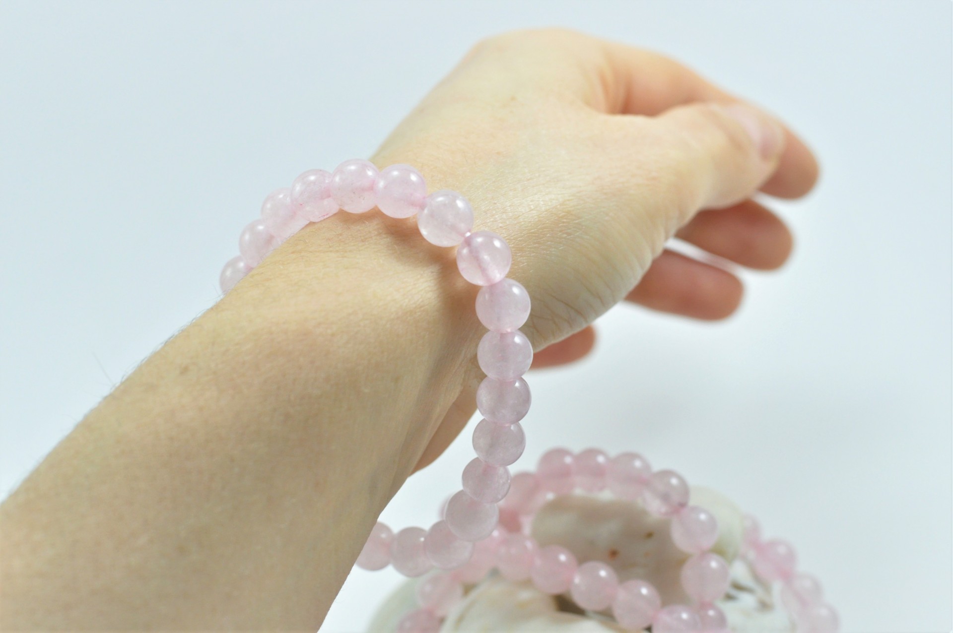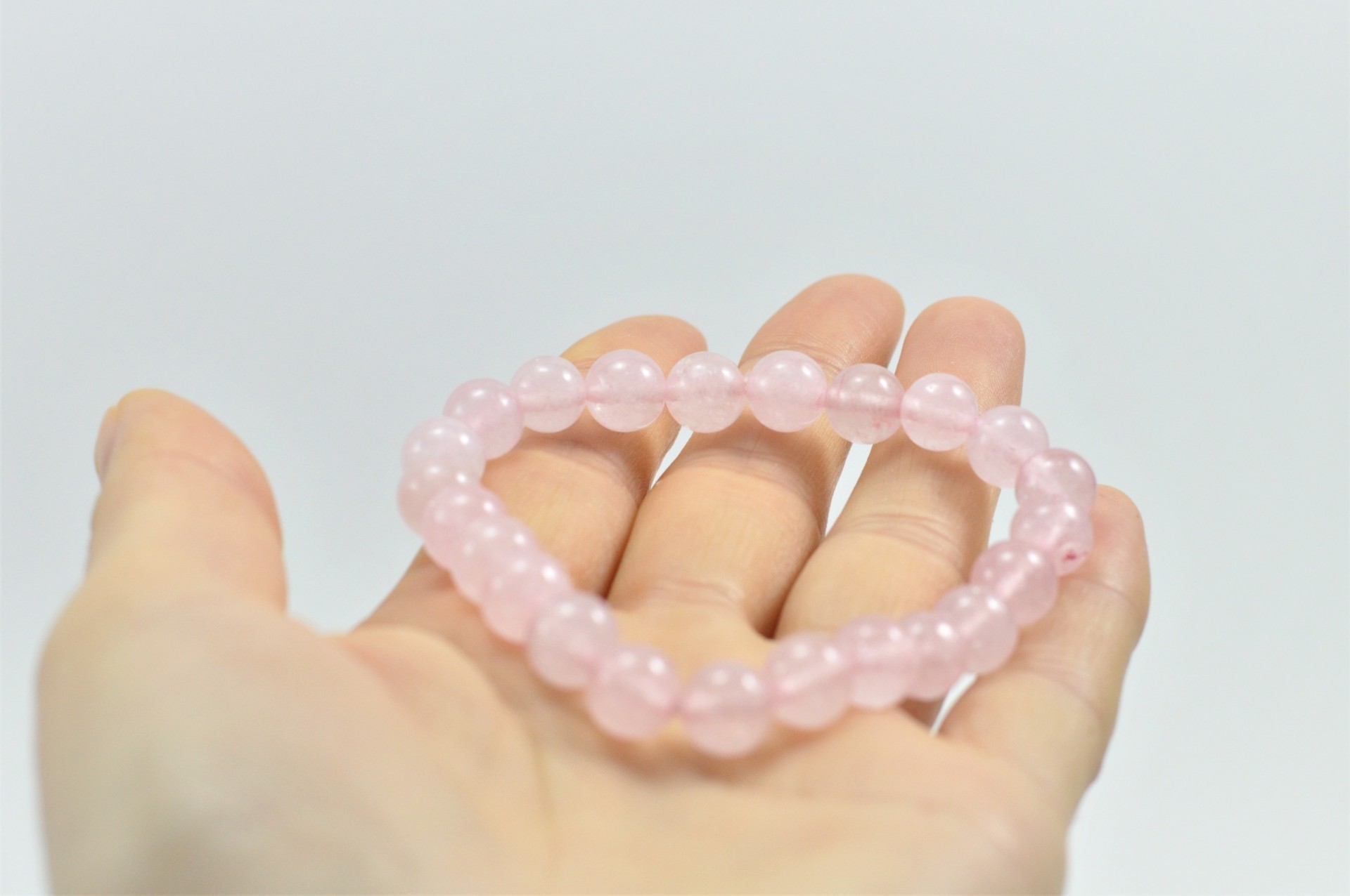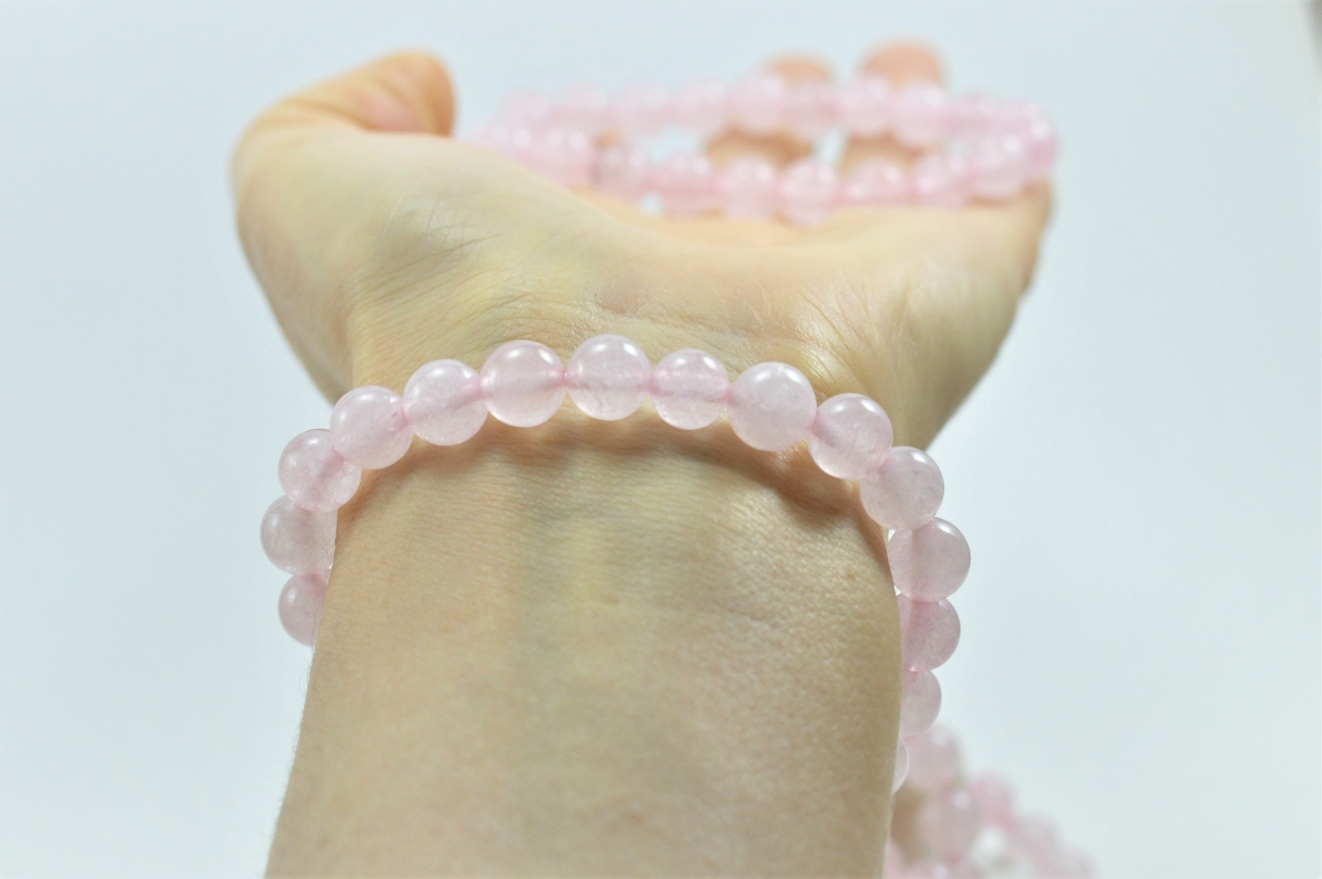 Pulseira realizada com bolas Quartzo Rosa de 8 mm cada. No total contém 23 bolas.